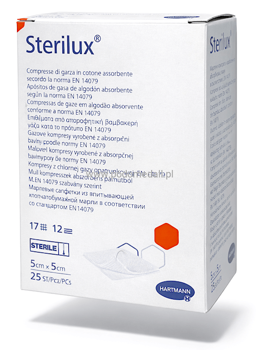 Kompresy jałowe STERILUX , 5x5 cm 12 warstwowe, gazowe, 17 nitkowa Hartmann, opakowanie 25szt