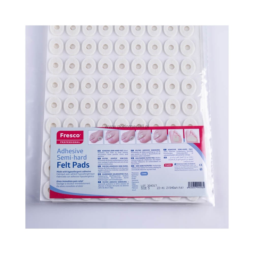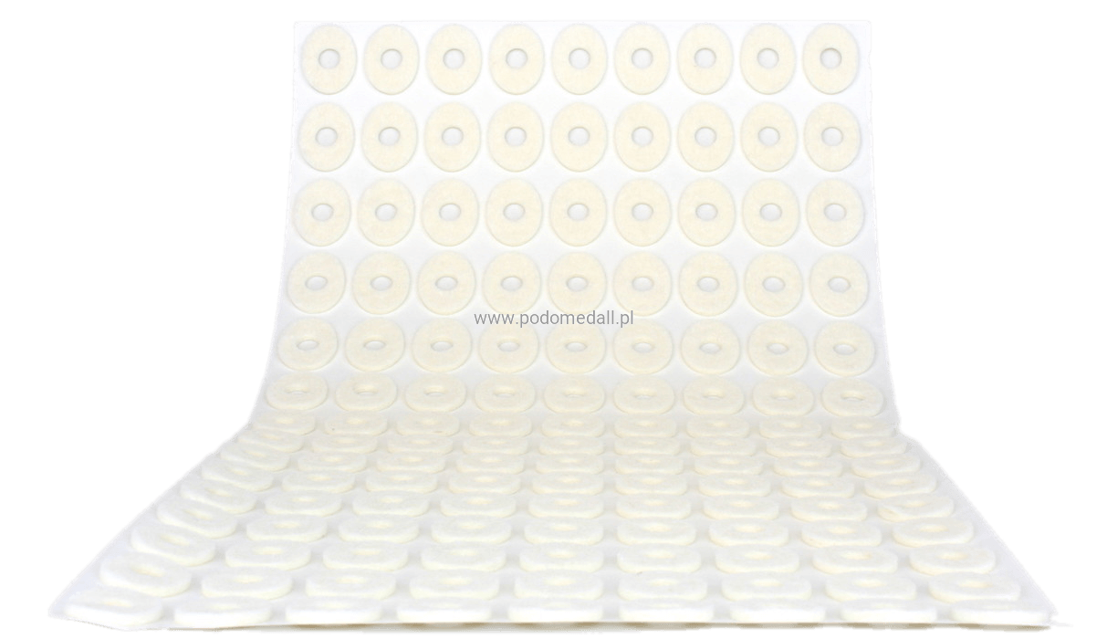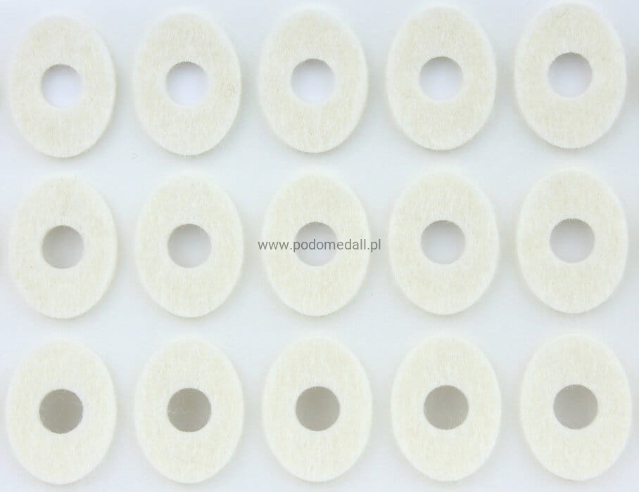 Owalne ortezy filcowe posiadają warstwę bezpiecznego kleju, który pozwala odciążeniom utrzymać się w odpowiednim miejscu stopy.