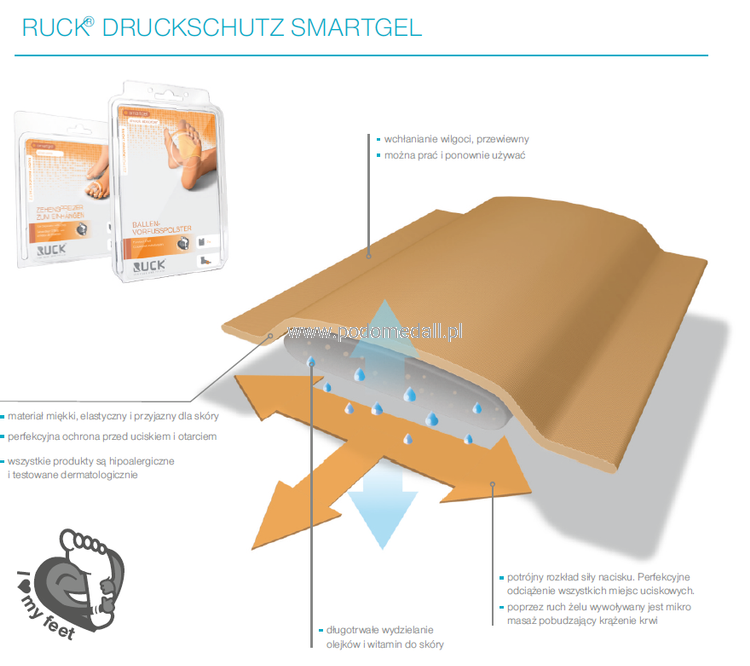 Opatentowany system wydzielania i przekazywania naturalnych olejków pielęgnacyjnych z ortezy do skóry podczas chodzenia delikatnie ją nawilża, pielęgnuje, zmiękcza zbyt twardą tkankę rogową, chroni przed tarciem.
